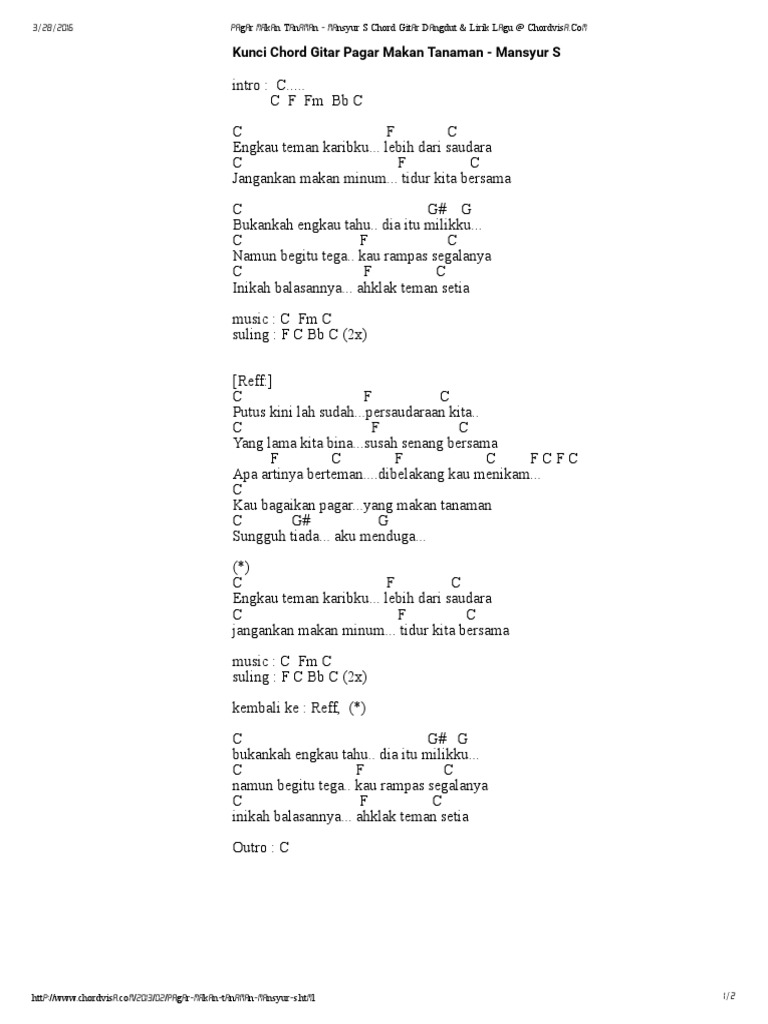 Berikut Chord Kunci Gitar dan Lirik Lagu Pagar Makan Tanaman yang dipopulerkan Mansyur S Rabu 2 Desember 2020 0922 WIB. Chord Gitar Lagu Pagar Makan Tanaman Oleh Mansyur S Tribunlampung Co Id. Capo fret 1 Intro C G Am Em F C Dm G C Csus4 C Verse Dm G Ada apakah gerangan C F mengapa kita semakin jauh Dm G hingga tanganku tak bisa lagi C menyentuhmu dan membelaimu Dm G Ternyata sahabatku menggodamu C F orang bilang pagar makan tanaman.